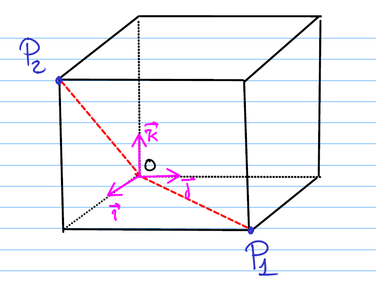La clé pour traiter l’exo consiste à mettre en place une base $(\ve{i}, \ve{j}, \ve{k})$, une origine $O$, et à placer des points $P_1, P_2$ qui nous permettront d’obtenir des vecteurs $\overrightarrow{O P}_1$ et $\overrightarrow{O P}_2$ associés aux deux diagonales. Nous pourrons ensuite appliquer la formule $$\overrightarrow{O P}_1 \cdot \overrightarrow{O P}_2=\left\|\overrightarrow{O P}_1\right\|\left\|\overrightarrow{O P}_2\right\| \cos (\theta)$$ pour obtenir la valeur de $\cos(\theta)$.